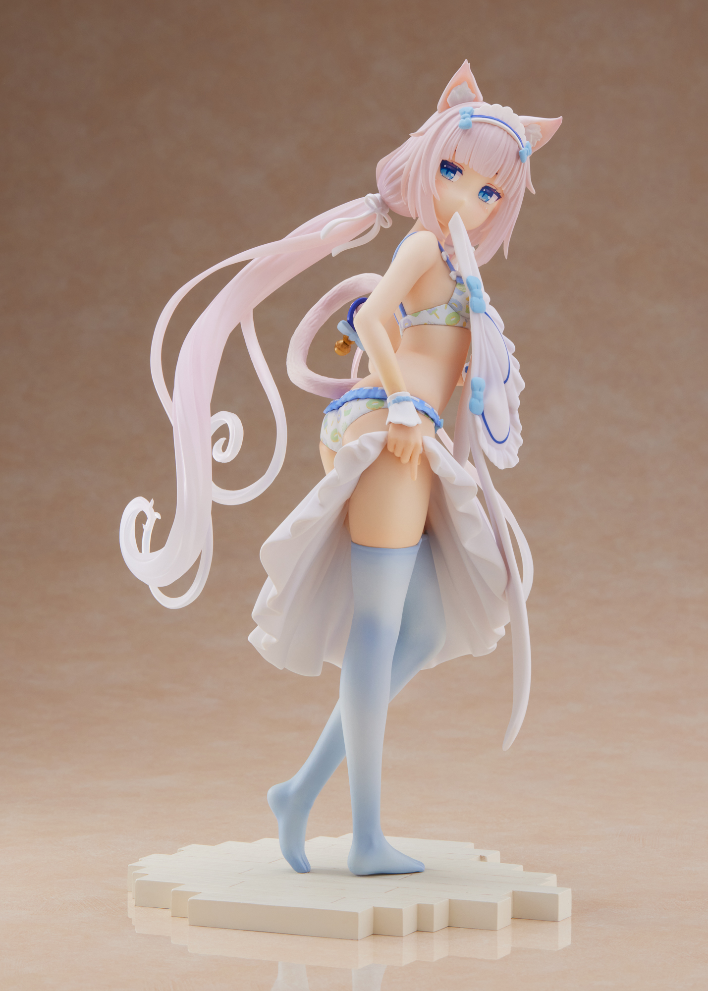 Her cute outfit with a pastel-colored sweets-themed designs and subtly translucent candy-like hair are just two highlights of this gorgeous figure! Her beautiful long hair, soft skin, the wrinkles in her underwear and even details of the uniform that she is taking off have all been carefully created in figure form. The base can be used with the separately sold figure of Vanilla to display them together. Be sure to add the two cat girls to your collection!