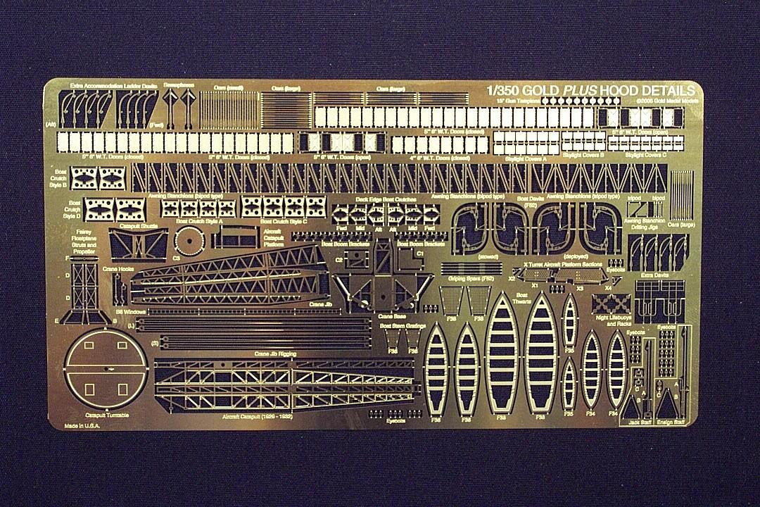 This set is custom designed for the Trumpeter HMS Hood kit and is intended to complement GMM's No. 350-37 Hood detailing set. It's etched in slightly thicker brass for added depth of detail and contains the following items: Additional watertight doors in the correct sizes and in two styles including open and closed versions; additional fold-to-shape crutches (chocks) for all ship's boats; complete set of 3-D relief-etched skylight covers for U.P. deck; highly accurate replacement davits and griping spars for two sea boats in choice of stowed and deployed positions; 3-D relief-etched thwarts and internal stern gratings for ship's boats; additional detailed awning stanchions in bipod and tripod styles with matching drilling jigs for both; additional small handling davits in several styles; see-through window frames for fighting top; detailed fold-to-shape night life buoys with stowage racks; 3-D relief etched tampions for 15" gun barrels; boat boom brackets for hull sides; highly detailed aircraft catapult and launching shuttle for 1929 - 1932 Hood; struts and propellers for Fairey floatplane provided for scratch builders; highly detailed aircraft recovery crane with rigging and hooks for 1929 - 1932 Hood; X-turret aircraft platform sections; detailed jackstaff with bullnose and ensign staff including braces & anchor lights; Extra eyebolts are provided for custom work. Numerous spare parts are furnished in the event of loss or damage.