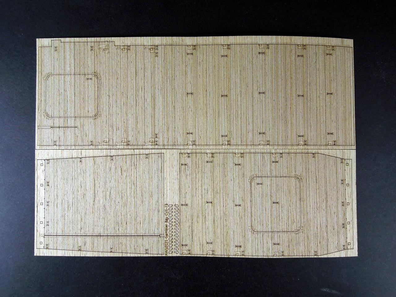The USS Gambier Bay (CVE-73) was a Casablanca-class escort carrier that served heroically during World War II. She is most remembered for her valiant stand during the Battle off Samar in October 1944, where she and other ships of Taffy 3 fought against overwhelming Japanese naval forces. Gambier Bay was the only U.S. aircraft carrier sunk by enemy surface gunfire during the war. This wood deck allows you to honor her courageous crew with a build that captures the authentic appearance of this brave ship.