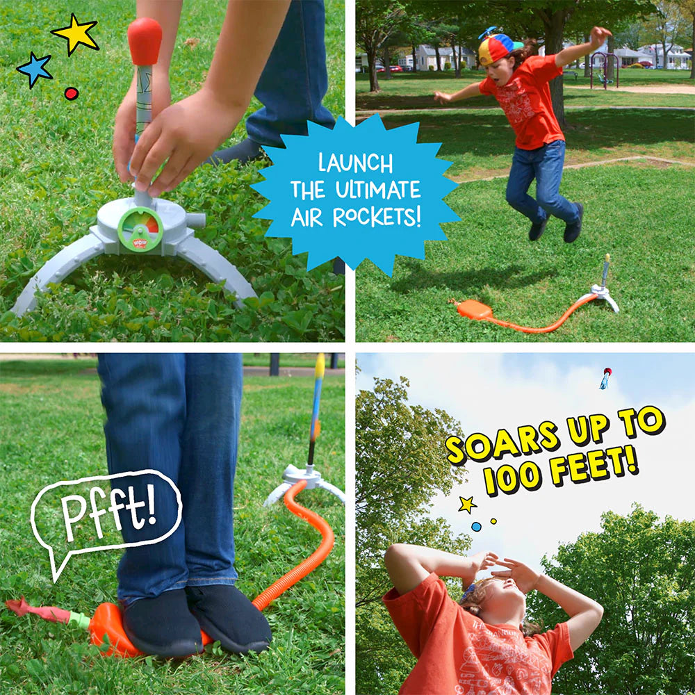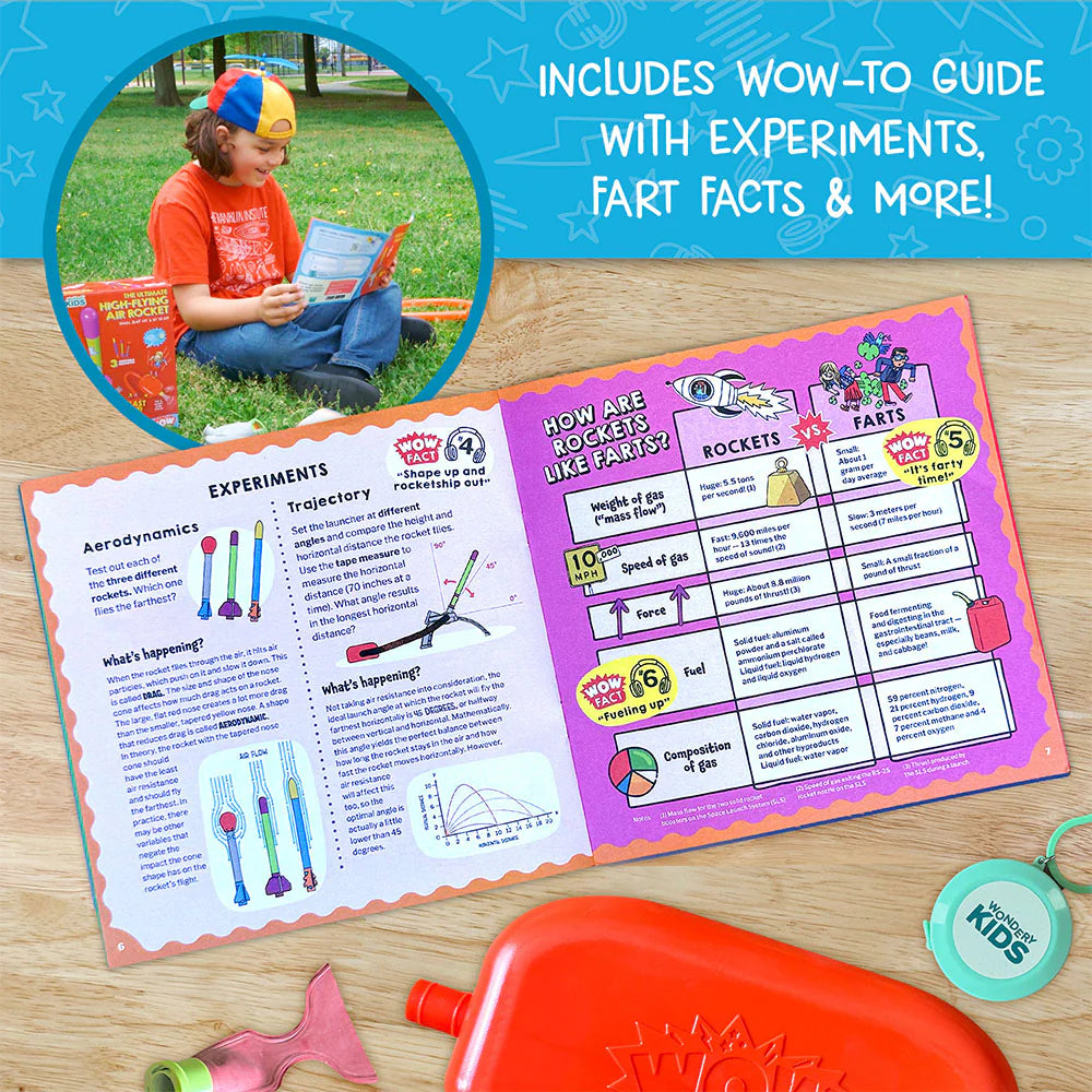 Blast off to hilarious science fun with your own high-flying air-powered rocket kit. Kids (and adults!) are in for an active afternoon of laughter and learning as they stomp to launch their rockets, making silly fart and whistle sounds in the process. The goofy sound effects jumpstart scientific investigations into physics and air pressure as kids learn how farts are, in fact, kind of like rockets! Experiment with three different rocket designs and customize them with stickers. Explore how the different sound-making nozzles affect the rockets’ performance. Adjust the angle of the launch tube to test your aim and to understand how the angle determines how far the rocket will fly. The launcher even has a simple air pressure meter so kids can analyze and understand their jump power. Store everything in the included mesh bag.