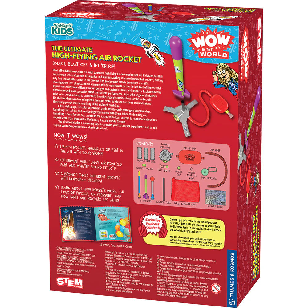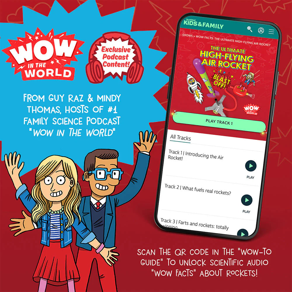 A fun, eight-page, full-color experiment guide assists you in setting up your launcher, launching the rockets, and conducting experiments with them. When the jumping and launching is done for the day, tune in to the exclusive podcast content to learn more about how rockets work from Wow in the World’s Guy Raz and Mindy Thomas.