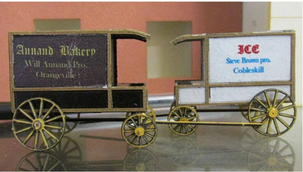 Delivery wagons based on drawing and Photos of wagons used from the 1850’s till the early 1900’s. Kit contains parts for Two wagons cut from laser board and micro plywood. Decals for four companies included.