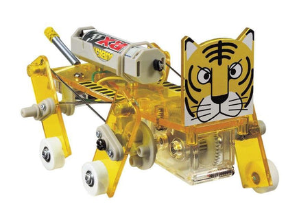 The Tamiya Mechanical Tiger is part of the Robocraft Series. Power from the Tiger’s rotating motor is transferred effortlessly to the legs via crank plates to make the tiger walk. The Tiger's body parts, molded using yellow semi-transparent plastic, give the tiger a futuristic look. Assembly is amazingly simple with the use of screws and snap-lock parts.