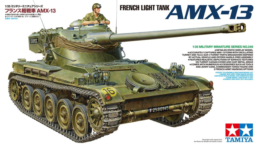 This is a 1/35 scale plastic model assembly kit of the French Light Tank AMX-13. Length: 183mm, width: 72mm. ★Extensive examination of a real AMX-13 enabled this highly realistic depiction of the external form of the tank and its oscillating turret. ★The construction of the upper turret section offers intuitive, hassle free construction with a breakdown influenced by that of real tank. ★Marvel at authentic depictions of the turret canvas cover, plus hull and turret cast metal surfaces. ★Realistic parts capture jerry cans and other accessories. ★Belt parts recreate rubber pad type tracks. ★Comes with commander torso for turret, and 2 French Army marking options.